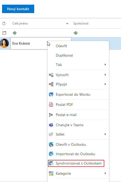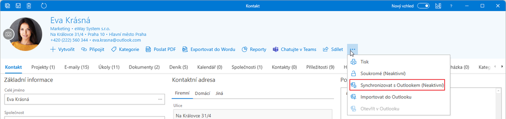 Synchronizovat kontakt s Outlookem můžete také přímo z karty kontaktu v aplikaci Microsoft Outlook. Učiníte tak kliknutím na tlačítko Synchronizovat s Outlookem v pravém horním rohu okna s detailem kontaktu.