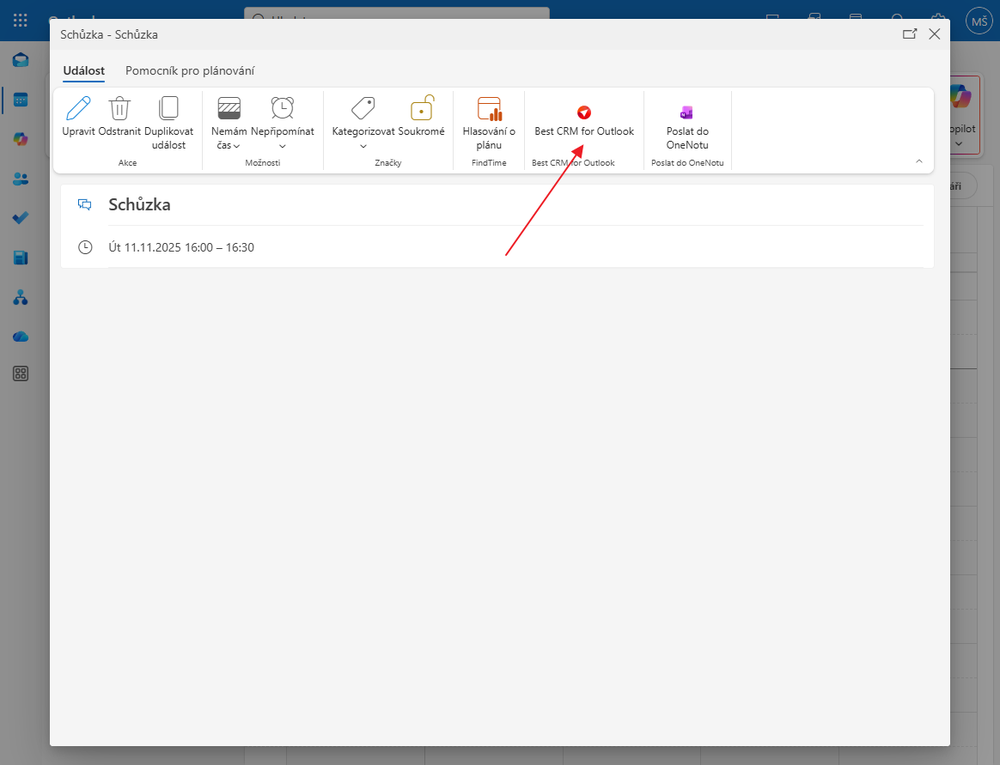 Po kliknutí na událost v kalendáři se zobrazí její detail. Zde máte v panelu nástrojů možnost kliknout na doplněk eWay-CRM.