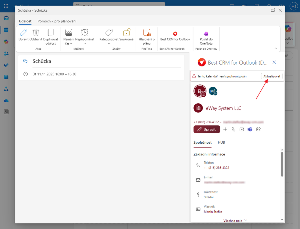 Jakmile tak učiníte, objeví se panel náhledu, v němž vidíte, jaké položky jsou s kalendářem spojeny, případně i informaci o tom, zda je kalendář synchronizován s vaším eWay-CRM účtem. Pokud nikoli, stačí kliknout na Aktualizovat.