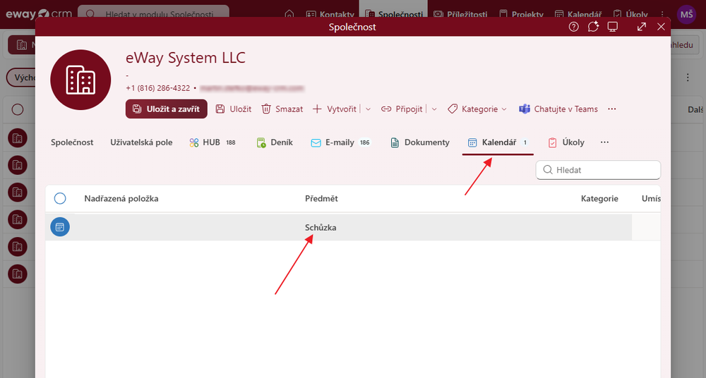 Všechny události, které jsou uložené k dané položce, je pak možné najít i na detailu položky. Takže pokud si otevřete společnost, s níž byla schůzka, uvidíte ji v záložce Kalendář.