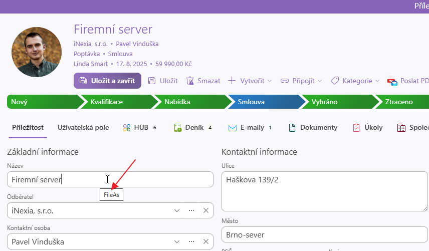 došlo tedy k tomu, že se doplnilo skutečné jméno dané nabídky. Pokud položka z proměnné neexistuje, nebo není hodnota, bude místo $CURRENT_ITEM[FileAs] jen prázdné místo.