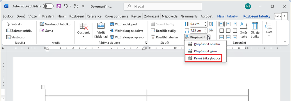 Když si vytvoříte tabulku a vložíte do ní zástupný znak, sloupec se roztáhne. Když se ale pokusíte sloupec zúžit, protože to potřebujete, nepůjde to. Zástupný znak se nezalamuje. Řešení je jednoduché. Klikněte do tabulky, nahoře přejděte do Rozložení tabulky a tady v Přizpůsobit vyberte Pevná šířka sloupců. Pak už si zúžíte sloupec, jak potřebujete.
