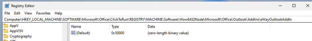 HKEY_LOCAL_MACHINE\SOFTWARE\Microsoft\Office\ClickToRun\REGISTRY\MACHINE\Software\Wow6432Node\Microsoft\Office\Outlook\AddIns\eWayAddin.Connect HKEY_LOCAL_MACHINE\SOFTWARE\Microsoft\Office\ClickToRun\REGISTRY\MACHINE\Software\Wow6432Node\Microsoft\Office\Outlook\AddIns\eWayOutlookAddIn