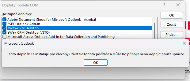 Jedná se o velmi specifický stav, k němuž dojde ve chvíli, kdy uživatel otevře Outlook jako administrátor. Pouze administrátor může doplněk smazat. Jak ukazuje obrázek níže, při otevření Outlooku standardní cestou, to možné není.