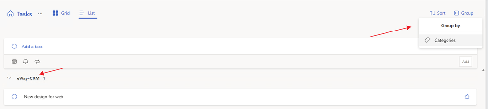Tasks are then displayed in a modern view. Tasks from eWay-CRM can be identified by their category. Just click Group and select Categories.